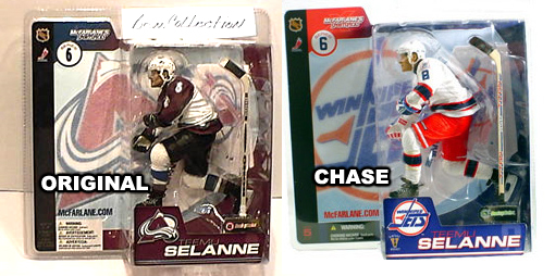 This is not the first time McFarlane has released a rare Winnipeg Jets figure. In 2003, they released thirteen Teemu Selanne super chase figures of him in his Winnipeg Jets jersey #13 (photoed on the right). One of those thirteen recently sold for $25,000!