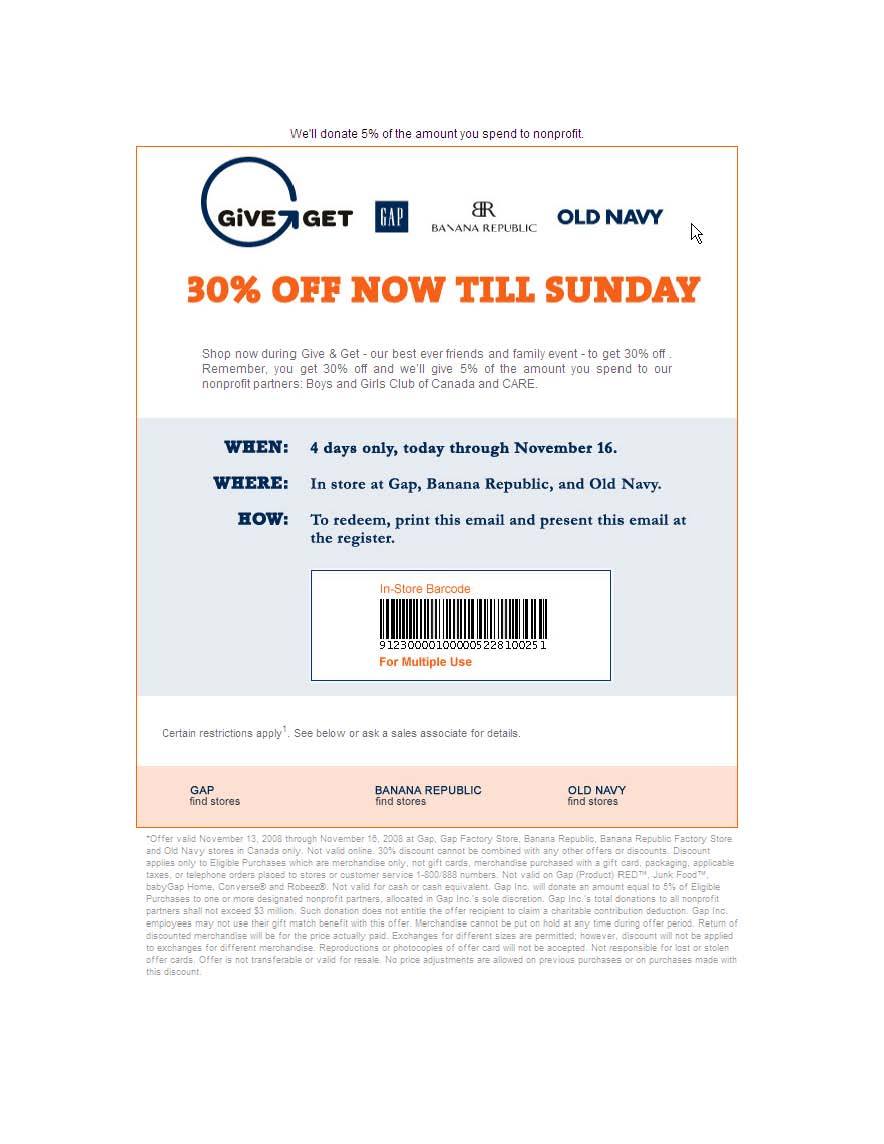 1. Offer valid November 13, 2008 through November 16, 2008 at Gap, Gap Factory Store, Banana Republic, Banana Republic Factory Store and Old Navy stores in Canada only. Not valid online. 30% discount cannot be combined with any other offers or discounts. Discount applies only to Eligible Purchases which are merchandise only, not gift cards, merchandise purchased with a gift card, packaging, applicable taxes, or telephone orders placed to stores or customer service 1-800/888 numbers. Not valid on Gap (Product) RED™, Junk Food™, babyGap Home, Converse® and Robeez®. Not valid for cash or cash equivalent. Gap Inc. will donate an amount equal to 5% of Eligible Purchases to one or more designated nonprofit partners, allocated in Gap Inc.’s sole discretion. Gap Inc.’s total donations to all nonprofit partners shall not exceed $3 million. Such donation does not entitle the offer recipient to claim a charitable contribution deduction. Gap Inc. employees may not use their gift match benefit with this offer. Merchandise cannot be put on hold at any time during offer period. Return of discounted merchandise will be for the price actually paid. Exchanges for different sizes are permitted; however, discount will not be applied to exchanges for different merchandise. Not responsible for lost or stolen offer cards. Offer is not transferable or valid for resale. No price adjustments are allowed on previous purchases or on purchases made with this discount.